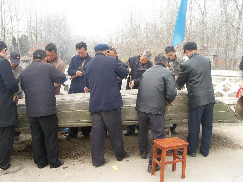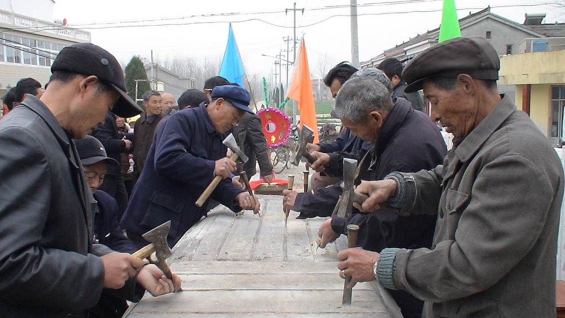 打排斧是一种生产劳动仪式,它是木匠在修造木船时,把加工后的油料、麻丝、石灰等材料填充在船板缝中的一种劳动。木匠们在木船两边一字排开,用斧头打击捻凿,捻凿敲击船体缝隙发出有节奏的声响,称为打排斧。